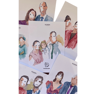 Como el servicio de acuarelas en directo no incluye las ilustraciones que no haya dado tiempo y, por experiencia, los invitados las suelen reclamar; ofrezco continuar el trabajo en el estudio y terminar aquellas ilustraciones que no se hayan podido terminar.