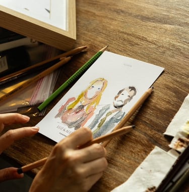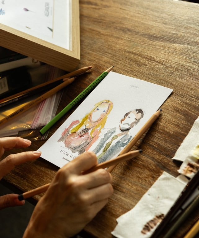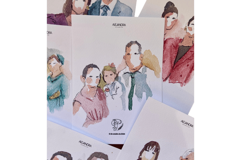 Para poder entregar el mayor número de ilustraciones posibles y asegurarnos de que los invitados de mayor importancia se lleven una ilustración, una vez contratado el servicio de acuarelas en vivo, ofrezco la posibilidad de esbozar a los invitados antes de la boda.