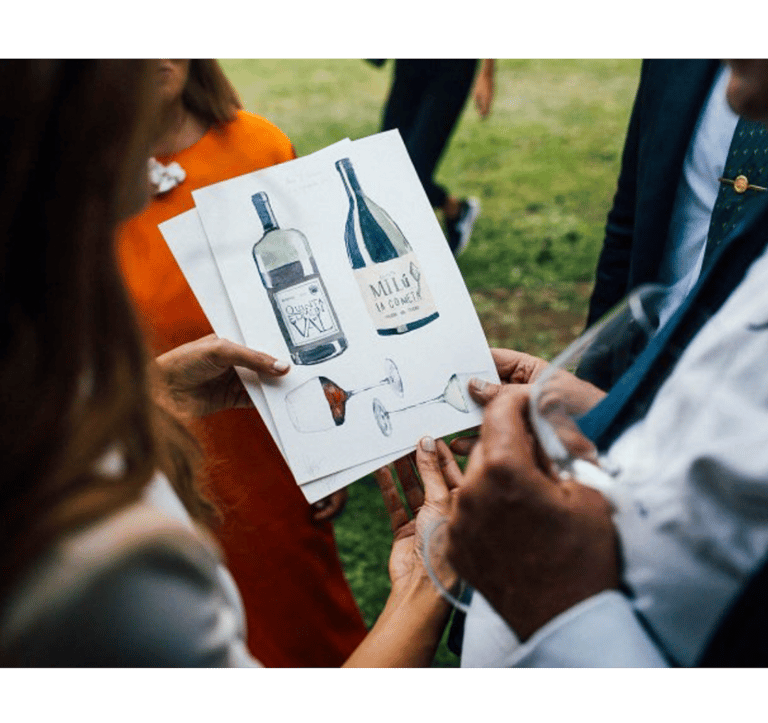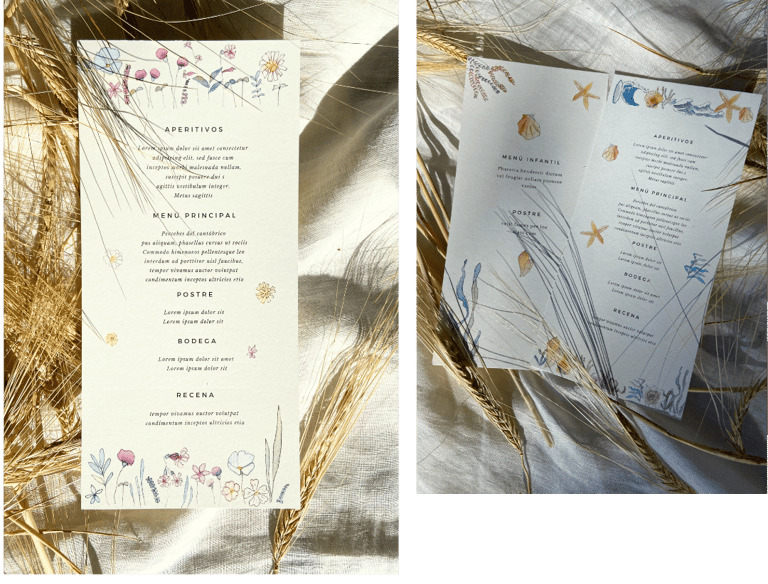 Una opción es seguir con la línea de diseño seleccionada en las minutas, donde se aplica el mismo patrón o motivos. Otra opción es personalizarlo y diseñar unas acuarelas ad hoc según la personalidad y gustos de los novios.